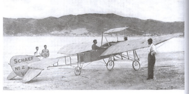 Arthur Schaef in his aircraft at Lyall Bay in 1912. Copyright and photographer unknown