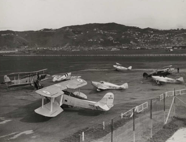 Aircraft at Rongotai Aerodrome. Dominion Post (Newspaper): Photographic negatives and prints of the Evening Post and Dominion newspapers. Ref: EP-Transport-Aviation, Historical-06. Alexander Turnbull Library, Wellington, New Zealand. /records/23122941