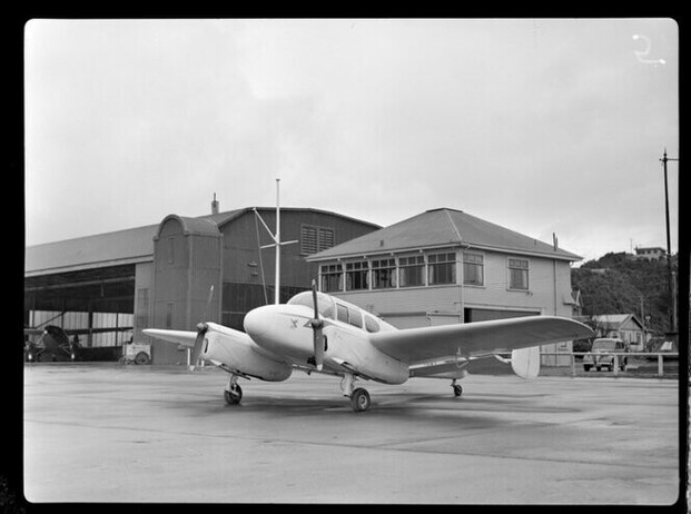 Miles Gemini aircraft at Wellington airport in August 1947. Whites Aviation Ltd: Photographs. Ref: WA-09223-F. Alexander Turnbull Library, Wellington, New Zealand. /records/23120927