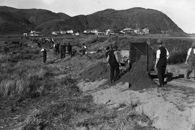 Relief workers constructing Rongotai Airport, circa 1930. Smith, Sydney Charles, 1888-1972: Photographs of New Zealand. Ref: 1/2-071566-F. Alexander Turnbull Library, Wellington, New Zealand. /records/22875761