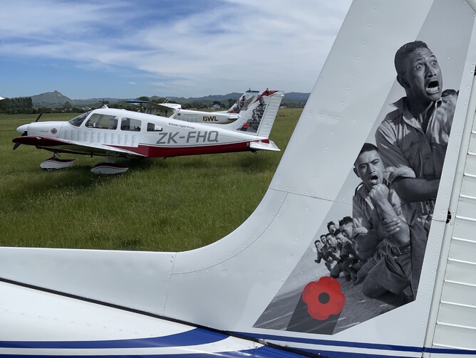 An image of the haka that members of the Māori Battalion performed for the King of Greece at Helwan, Egypt in June 1941 adorns the tail of each aircraft on the vaccination awareness drive. Cessna 185 ZK-CDY is in the foreground.